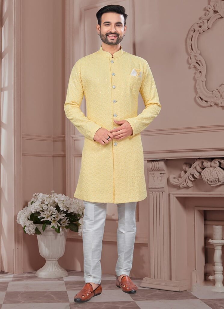 Light Yellow Rayon Embroidered Sequins Indowestern Sherwani
