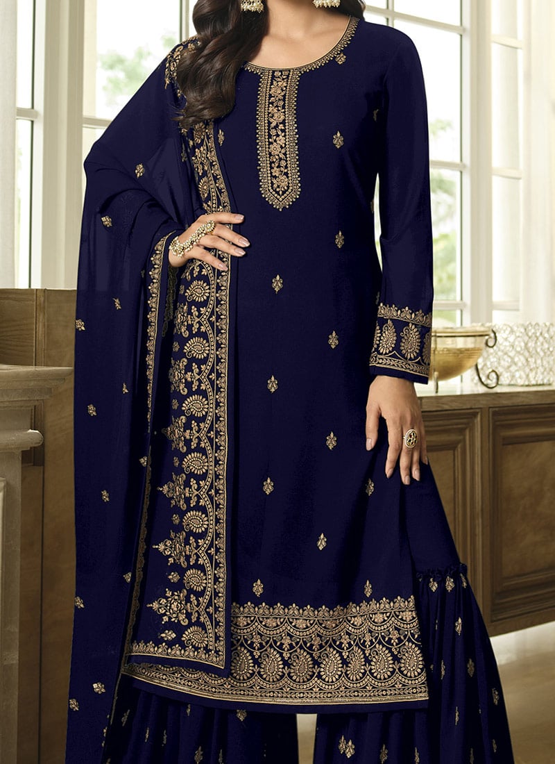 The Blue Georgette Sharara Suit with Embroidery is an elegant ethnic ensemble designed for glamorous party occasions and grand wedding celebrations. Crafted from premium georgette fabric, this sharara suit offers a graceful drape with a rich festive appeal, making it a perfect choice for statement dressing.