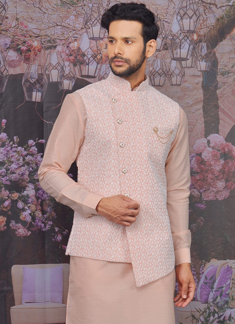 Elevate your festive and party wardrobe with the Light Peach Banarasi Art Silk Bandi Set, a perfect blend of traditional elegance and contemporary style. Crafted from premium Banarasi art silk, this ensemble exudes sophistication with its rich texture, subtle sheen, and intricate detailing. The bandi jacket is designed with meticulous Banarasi motifs, giving it a regal and festive appeal. Its tailored fit and structured silhouette make it an ideal choice for weddings, engagement ceremonies, Diwali, and other celebratory occasions. The light peach hue adds a soft, elegant touch, making it suitable for daytime and evening events. Paired with a matching bottom and dupatta, the set creates a harmonious and polished look. The lightweight and breathable art silk fabric ensures comfort without compromising style, allowing you to enjoy long hours of festivities effortlessly. Perfect for festive gatherings, family celebrations, or party wear, the Light Peach Banarasi Art Silk Bandi Set combines traditional craftsmanship with modern elegance. Pair it with statement accessories and stylish footwear to complete your festive ensemble.
