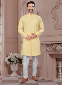 Design Style Indowestern fusion with knee-length cut, modern tailoring, and classic silhouette