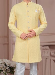 Add festive charm to your celebration look with this Light Yellow Rayon Indowestern Sherwani, featuring delicate sequin embroidery and a soft, breathable fit. Paired with off-white Dupion silk pants, it offers elegance and modern sophistication for weddings and festive events.