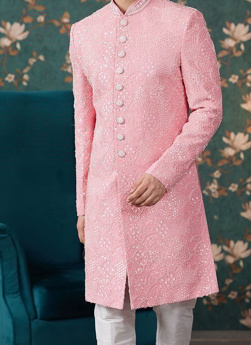Pink Art Silk Hand Embroidered Sherwani with Sequins & Beads