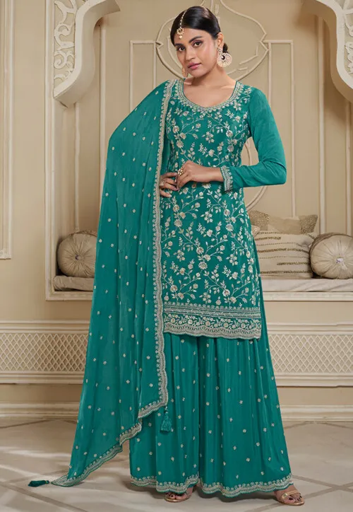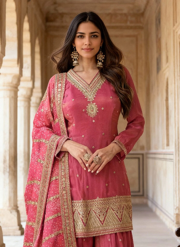 Brighten your festive wardrobe with this Yellow Chinon Sharara Suit with Zari, Bead & Thread Embroidery, designed to deliver vibrant elegance with traditional charm. Crafted from premium chinon fabric, this sharara suit features intricate zari, bead, and thread embroidery that adds rich texture and festive brilliance, making it a perfect choice for celebrations and party wear.