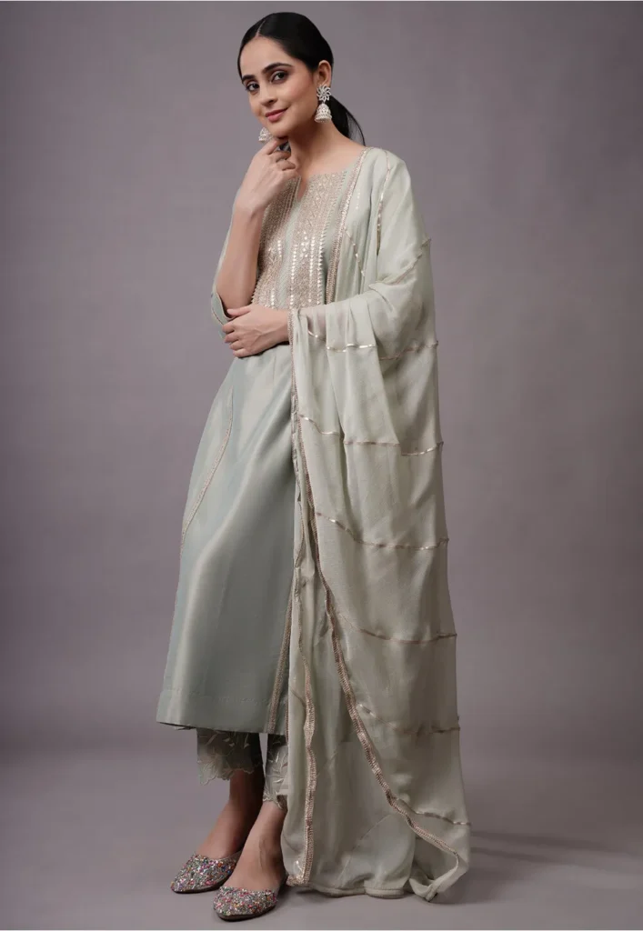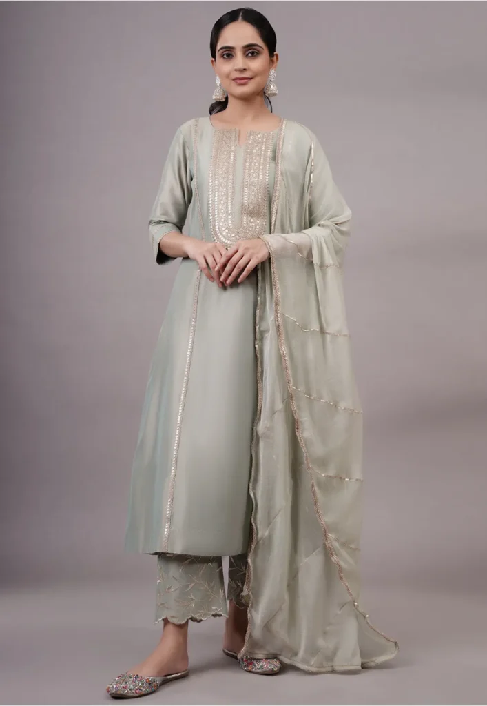 The Yellow Chinon Sharara Suit with Zari, Bead & Thread Embroidery showcases a beautifully flared sharara silhouette that offers graceful movement and a striking festive look. The lightweight chinon fabric ensures comfort and flow, while the detailed handwork elevates its appeal, making it ideal for weddings, festive functions, and evening gatherings.
