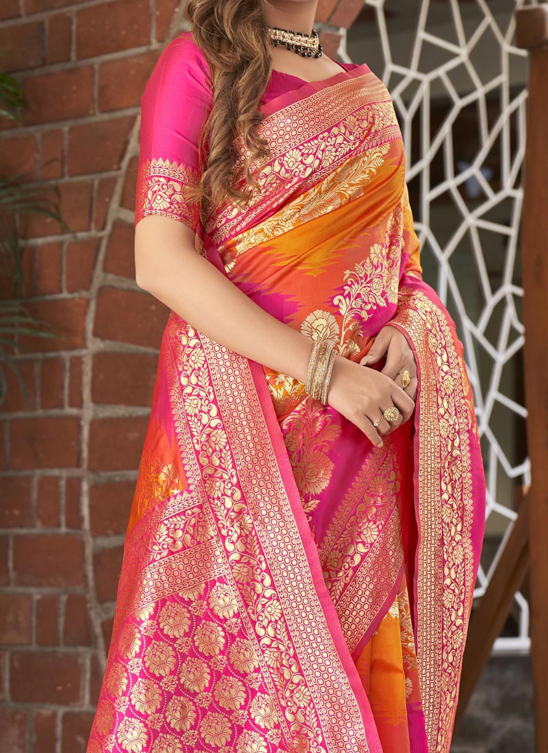 Yellow & Orange Benarasi Saree with Golden Zari Jacquard Work